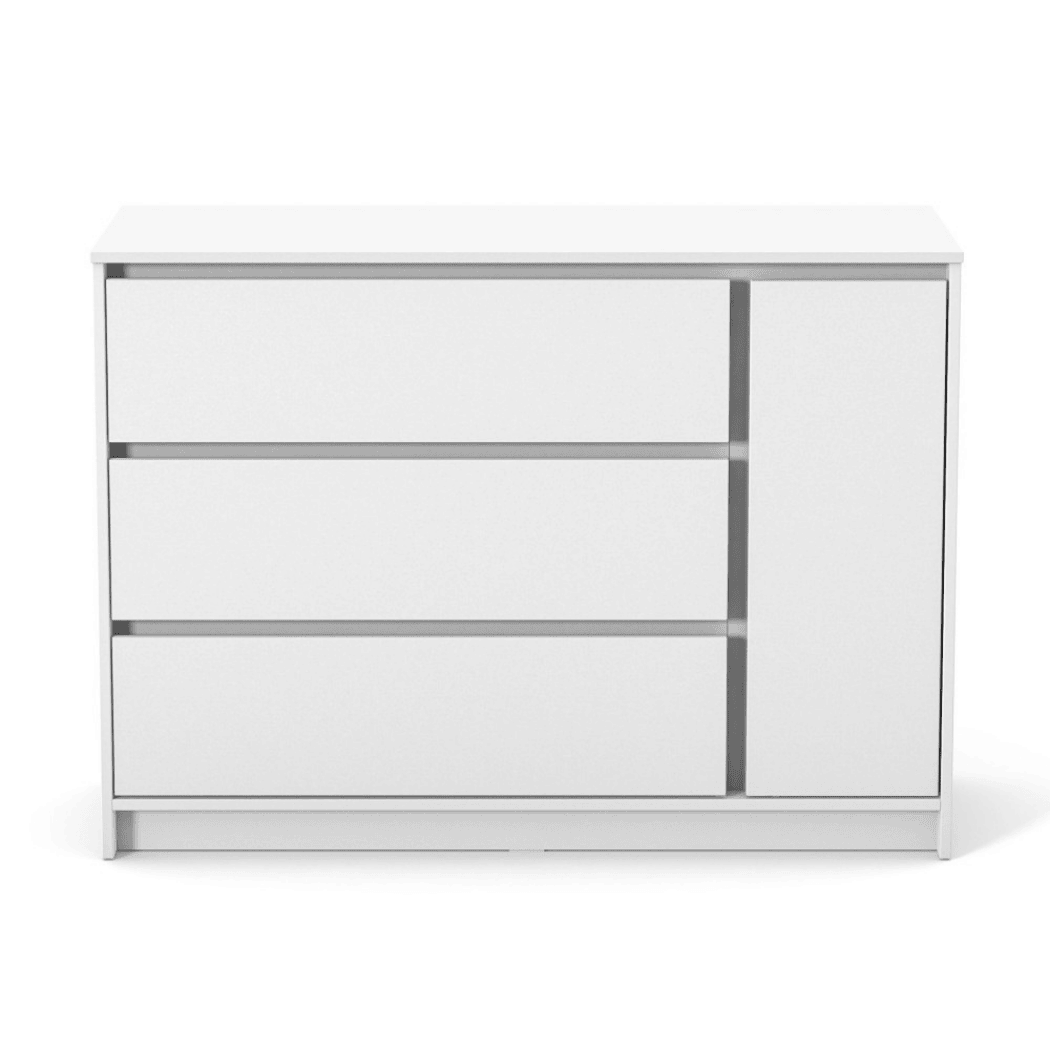 Komoda Lovitto 1200 je vybavena třemi prostornými výsuvnými zásuvkami s teleskopickými vodítky, které zajišťují plynulý pohyb. Za dvířky se nacházejí dvě police, které se skvěle hodí pro ukládání dětských věcí, hraček nebo hygienických potřeb.