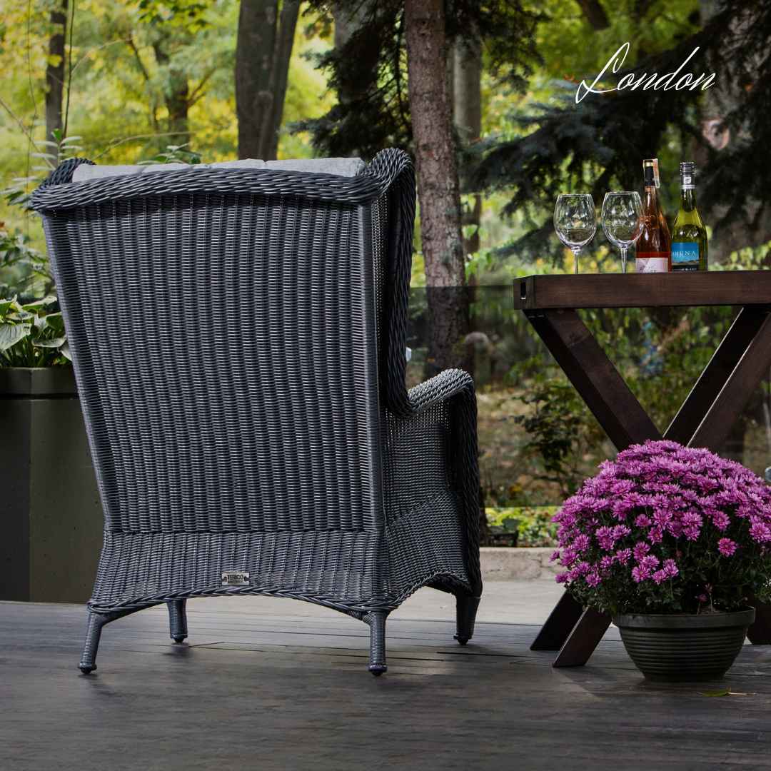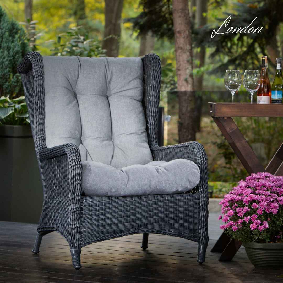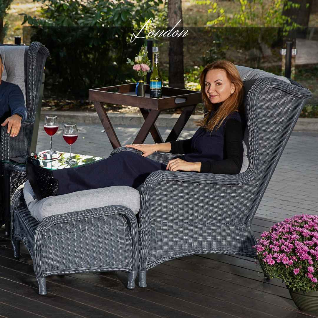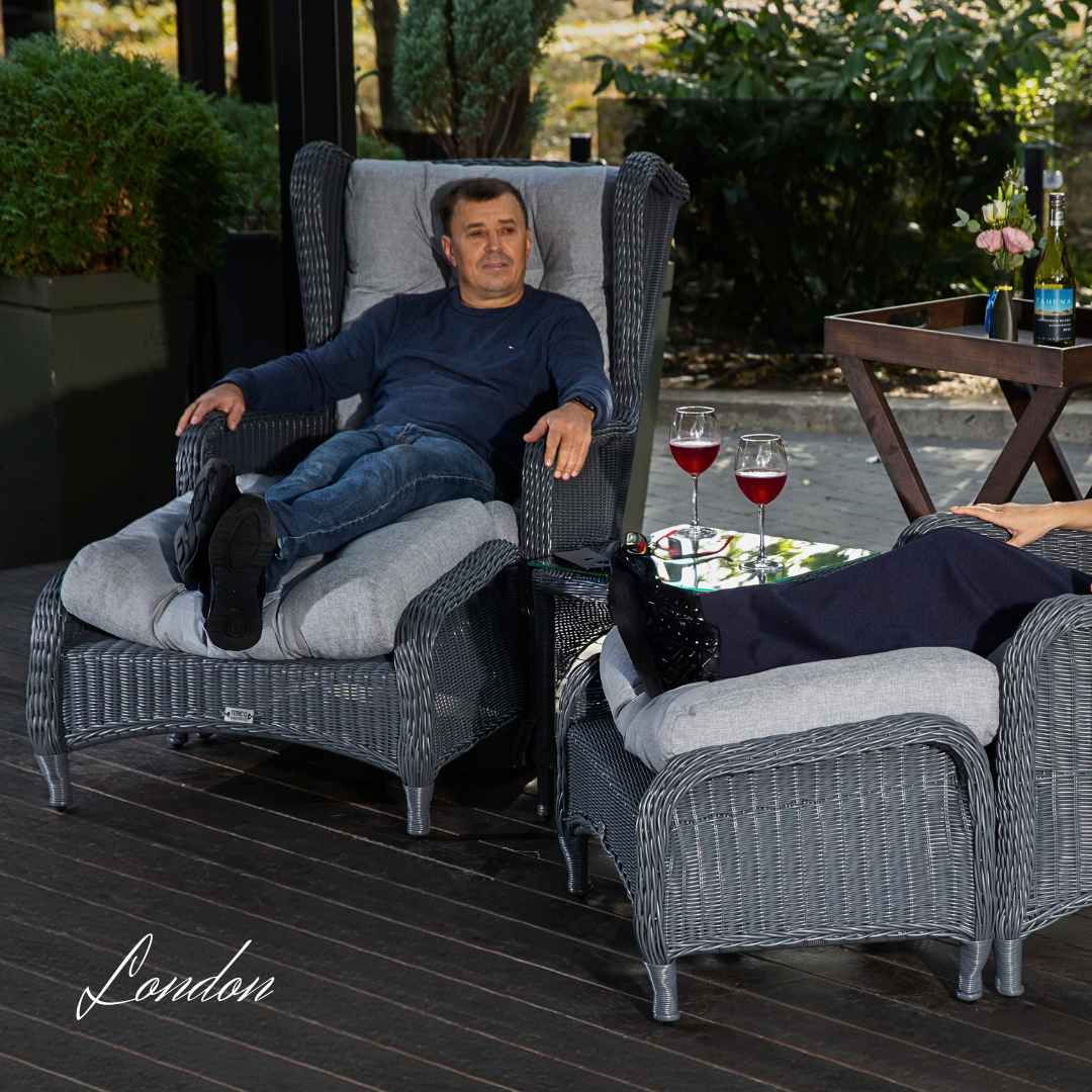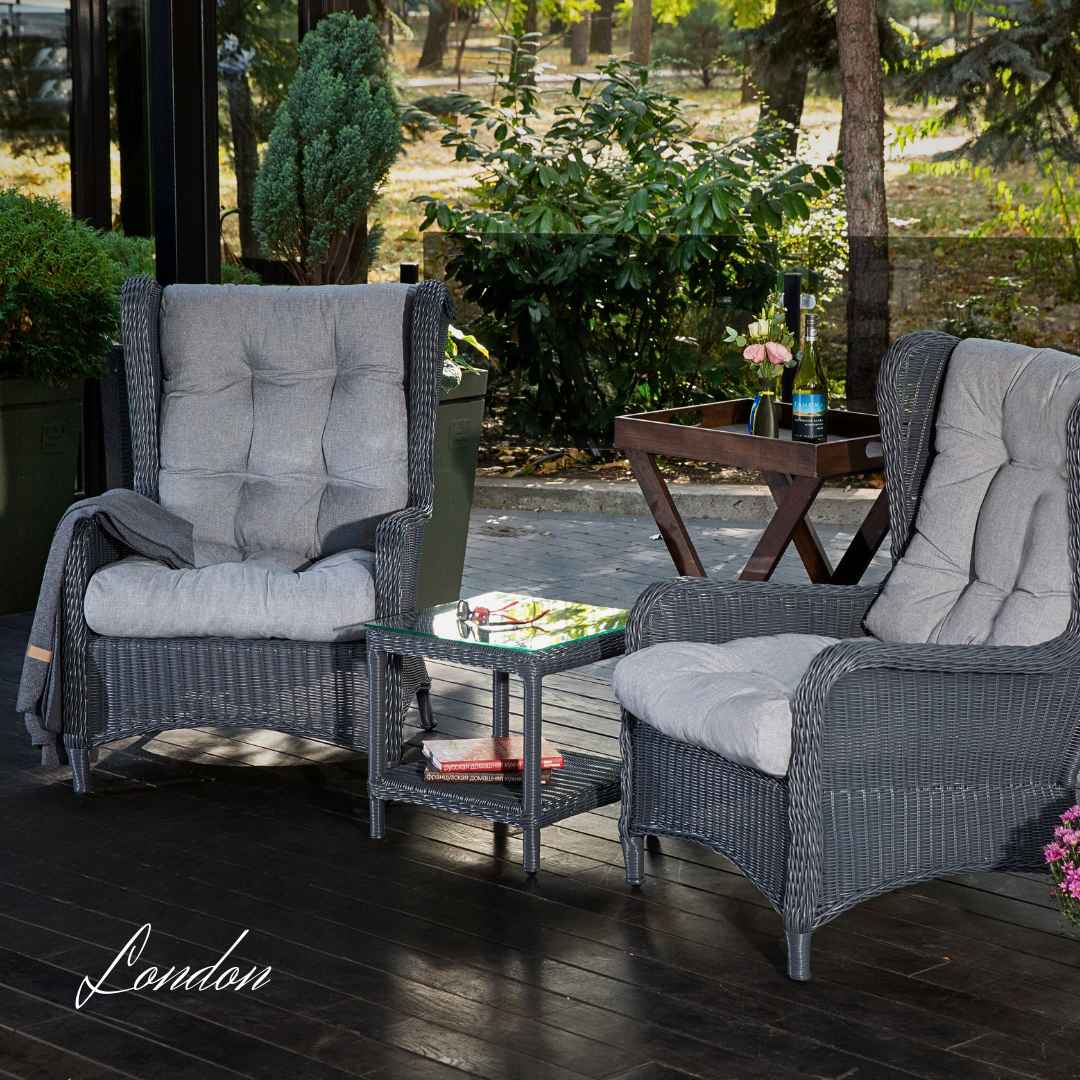 - Zahradní sedací sestava LONDON LOUNGE Terico. Skládá se ze dvou velkých křesel, dvou podnožek a konferenčního stolku.