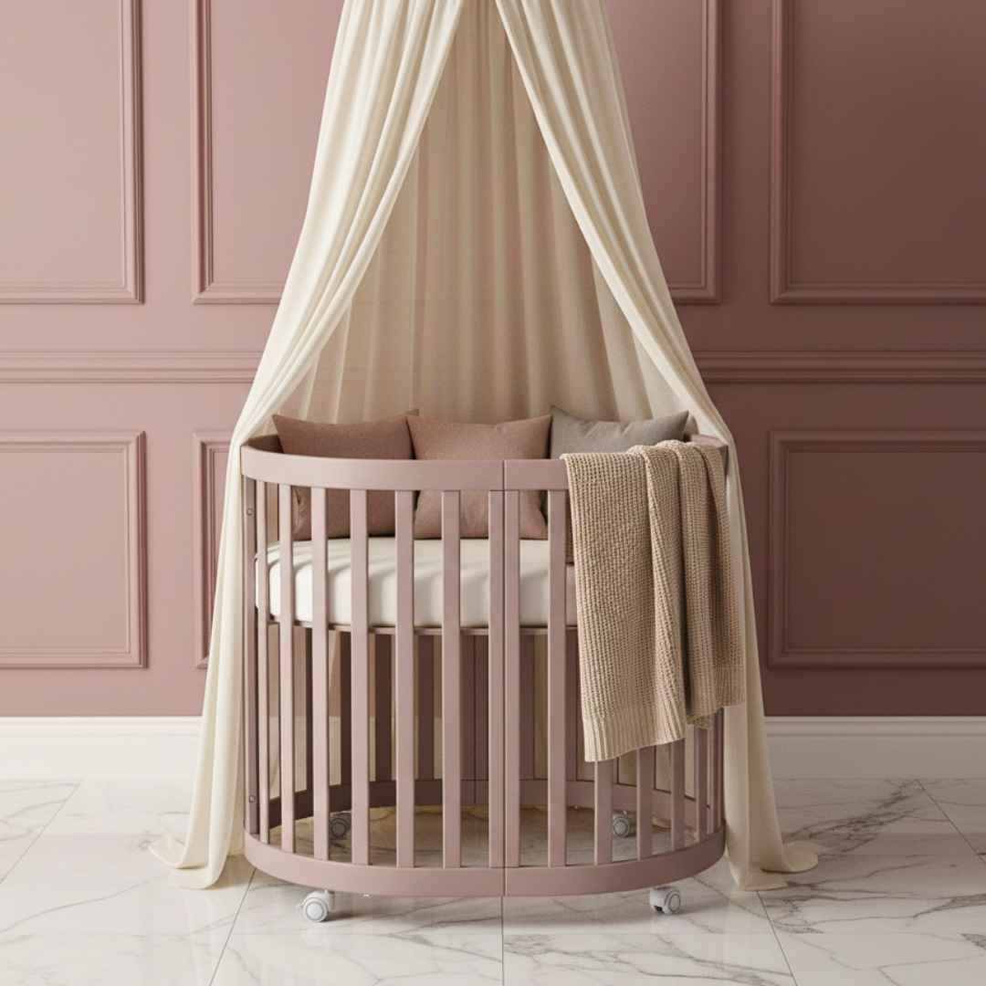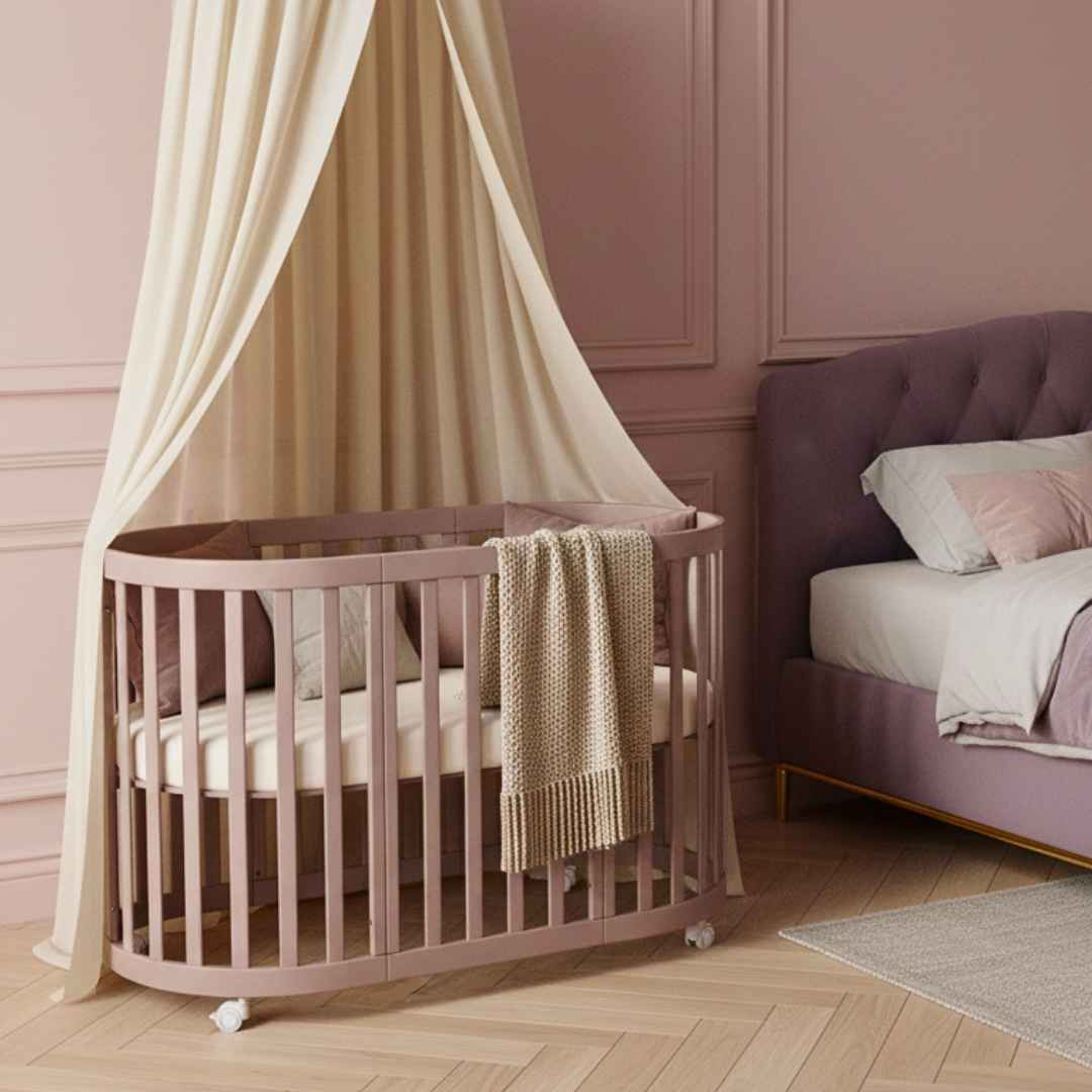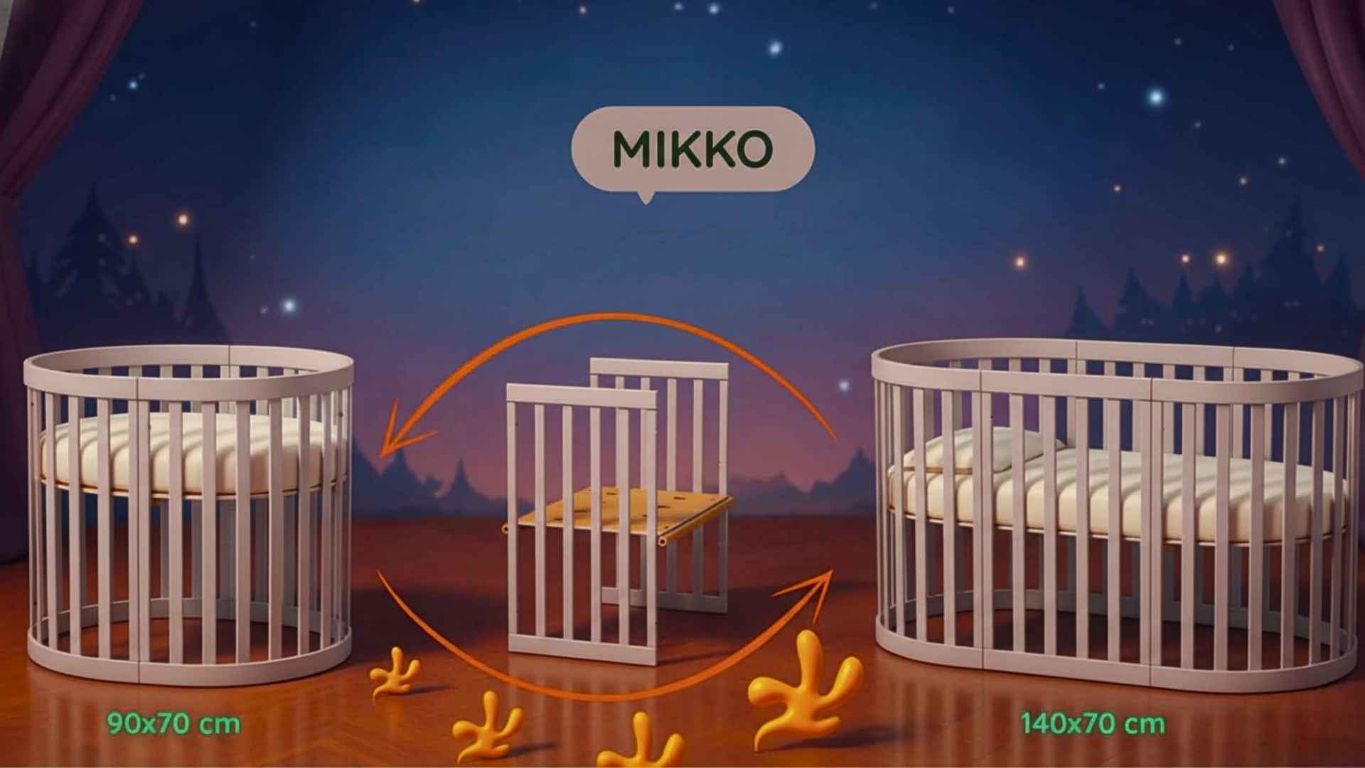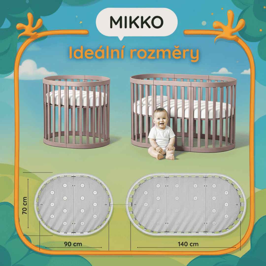 - Dětská oválná postýlka Mikko o rozměrech 90×70 cm;