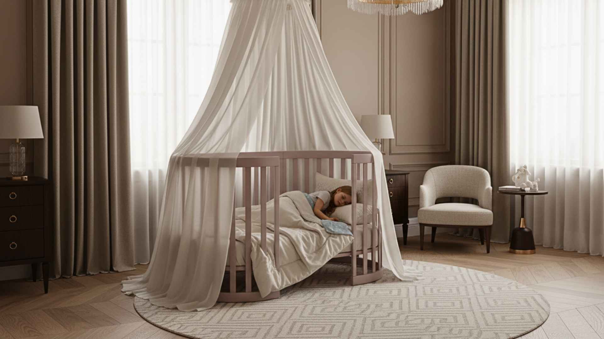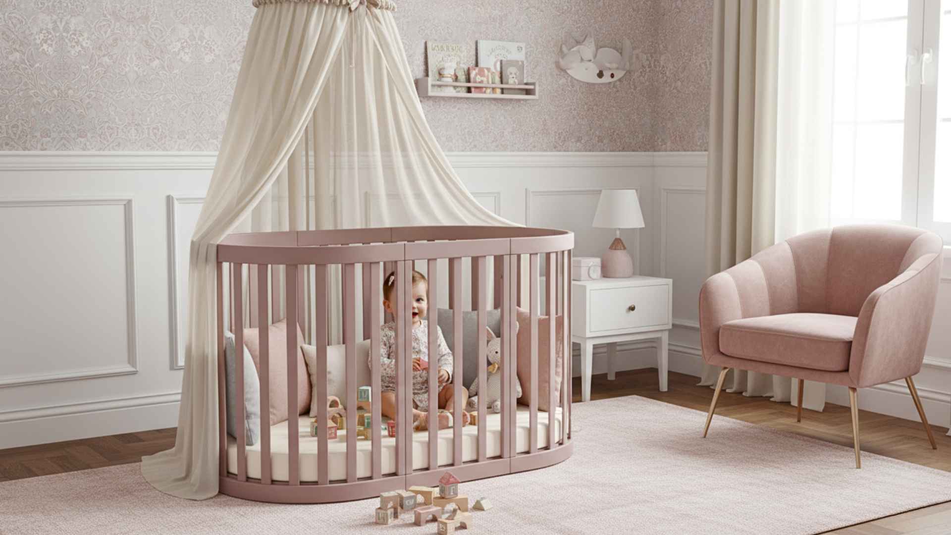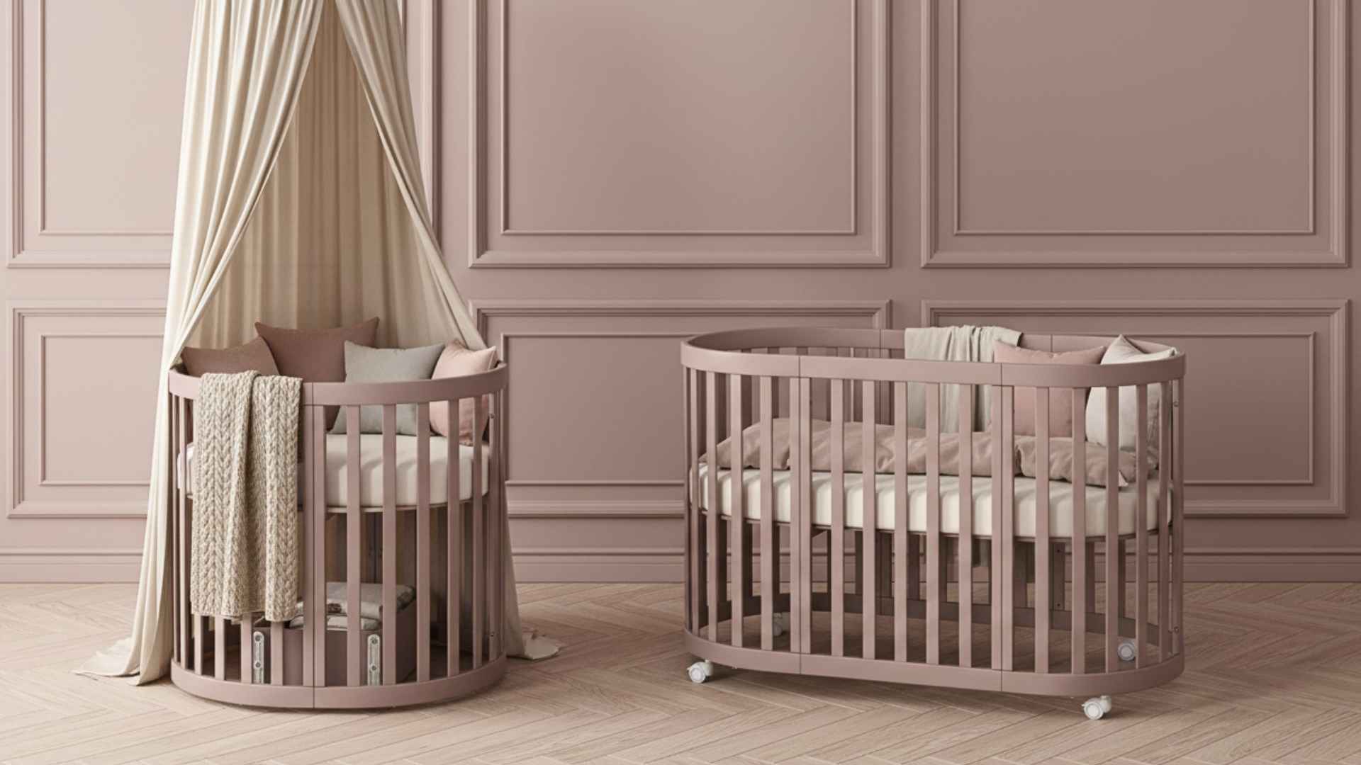 - Dětská oválná postýlka Mikko o rozměrech 90×70 cm;