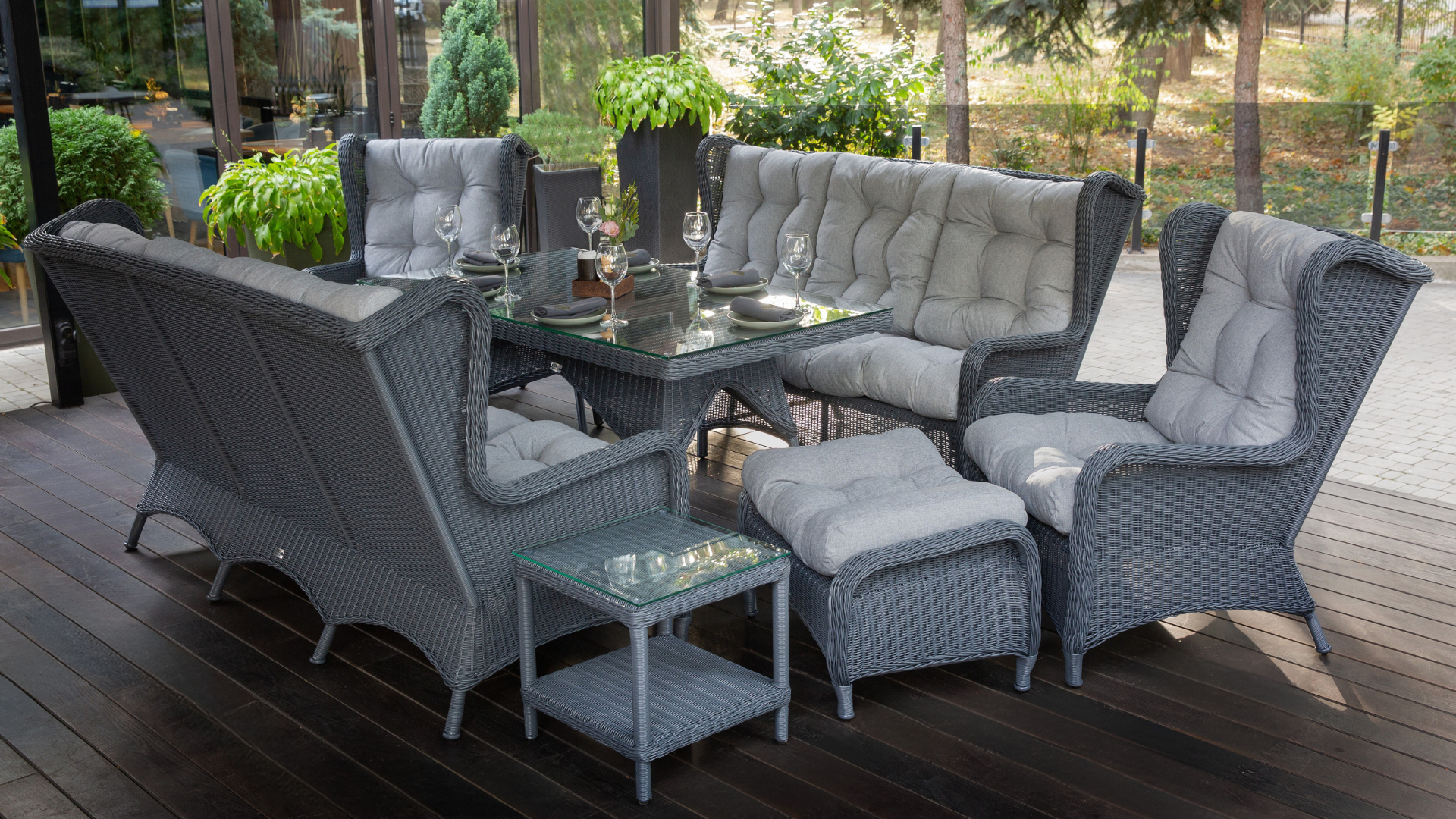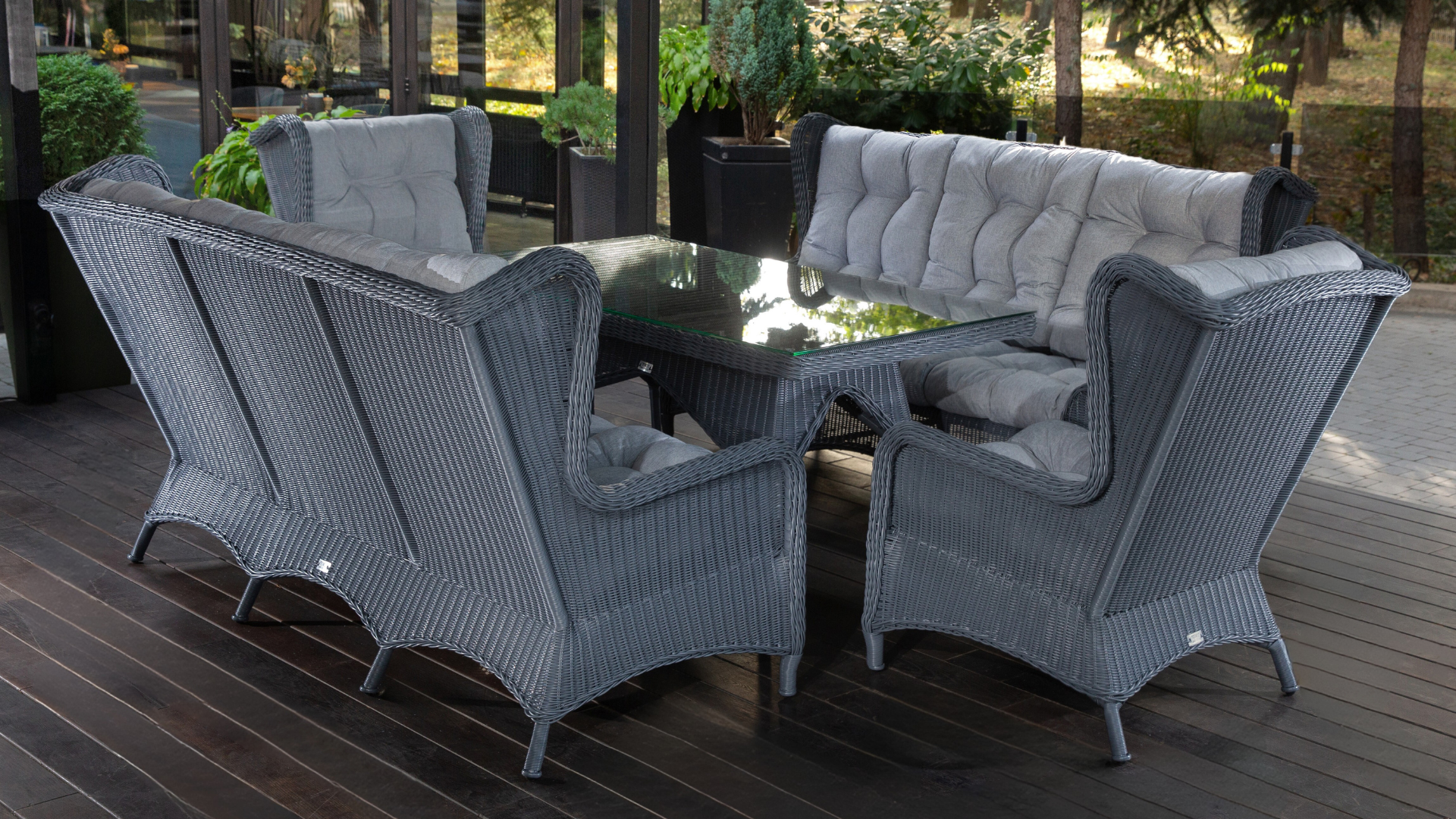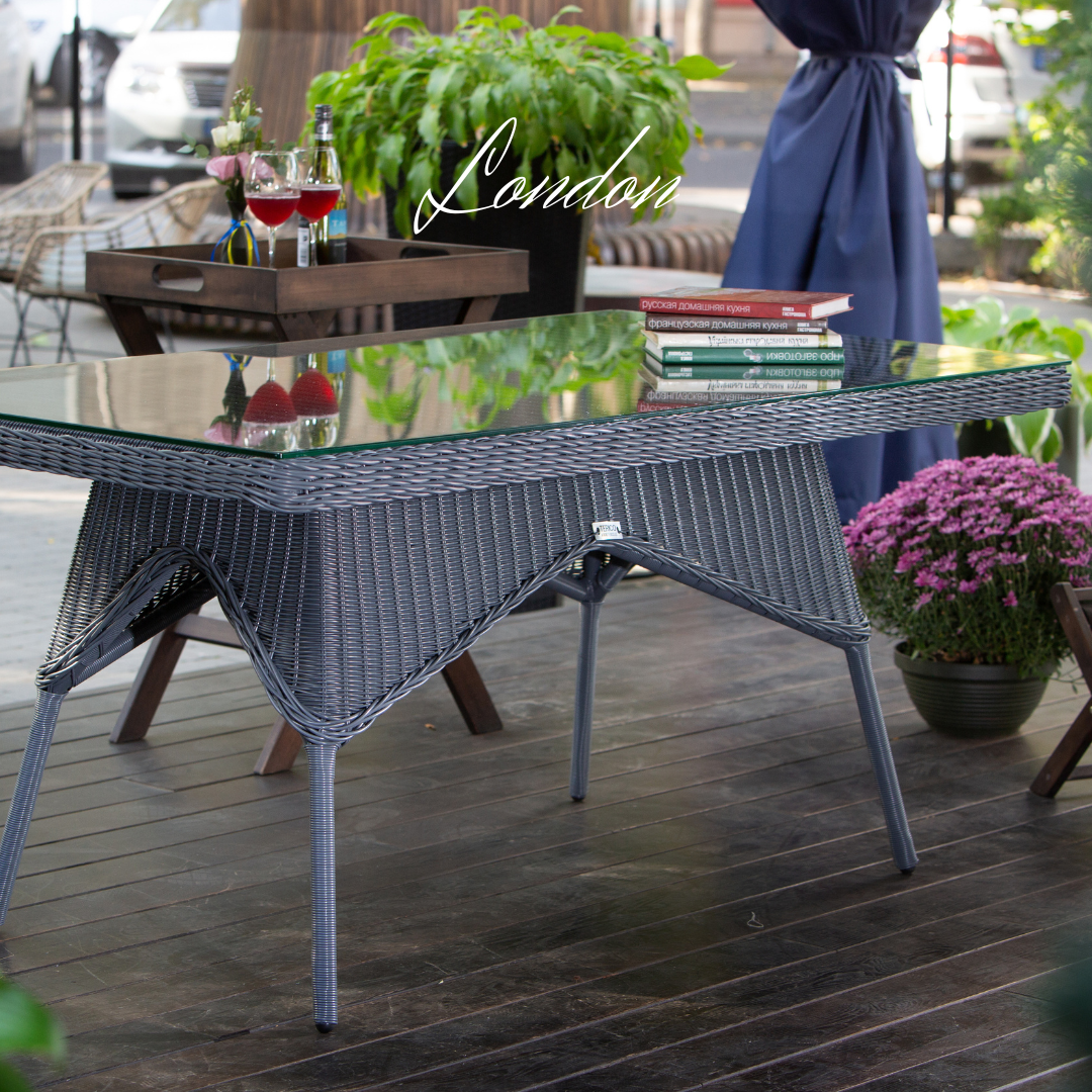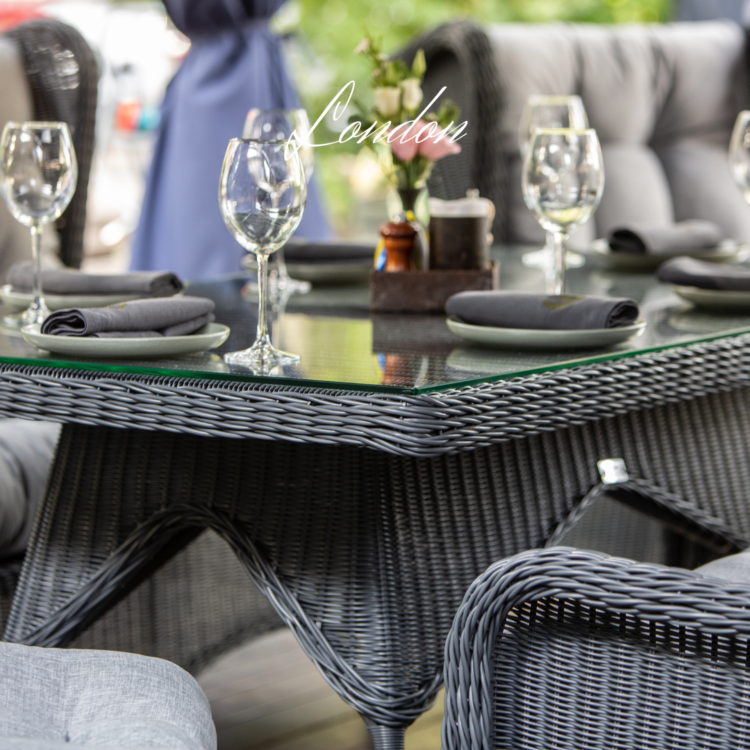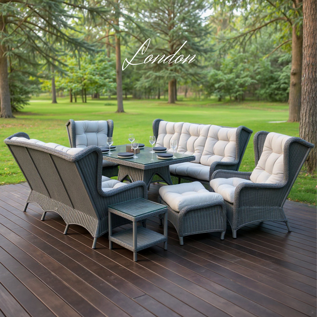 - Ratanová venkovní jídelní sestava LONDON FAMILY Terico. Skládá se z jídelního stolu, dvou třímístných pohovek, dvou velkých křesel, dvou podnožek a konferenčního stolku.